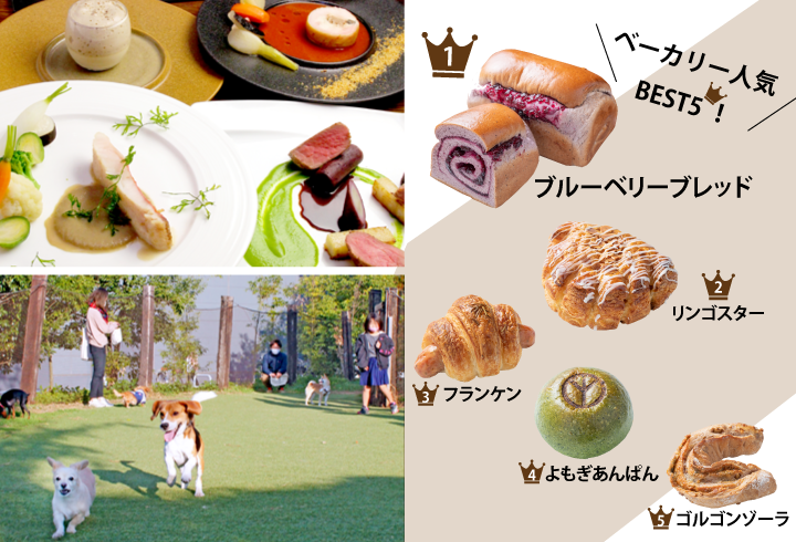時間 レストラン 9:00~22:00(L.O.21:30)/ベーカリー 9:00~20:00/ドッグカフェ 9:00~21:00(L.O.20:00)