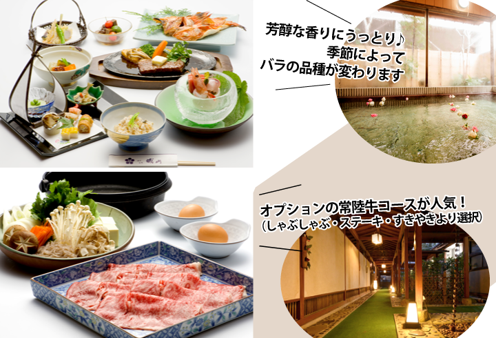 笠間稲荷神社の参拝客で賑わう仲見世通りを入って歩くこと5分。そこには喧騒から離れた、数寄屋造りの隠れ家的な旅館が現れます。全8室の部屋はそれぞれに名前があり、少しずつ違った顔を持ちます。2階にある「筑波」の窓から見えるのは笠間を代表する佐伯山。離れ部屋の「くるみ」はお子様連れでも気兼ねなく寛げます。お風呂は茨城県花である薔薇の花を浮かべた薔薇風呂。ふわりと香る華やかな香りに包まれながら日頃の疲れを癒しましょう。