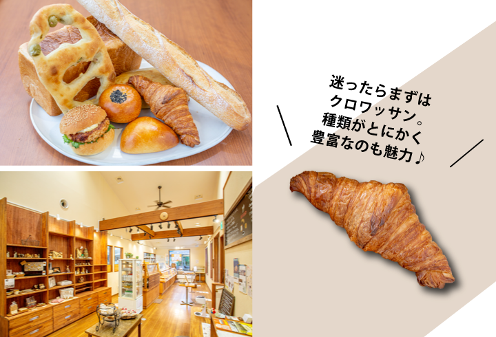 豊富なラインナップの中でもイチ押しなのはクロワッサン。サクサクの食感と発酵バターの芳香がさらに食欲を刺激します。そして自慢の食パンは天然酵母によるしっとり&ふんわりとした口当たりが魅力です。