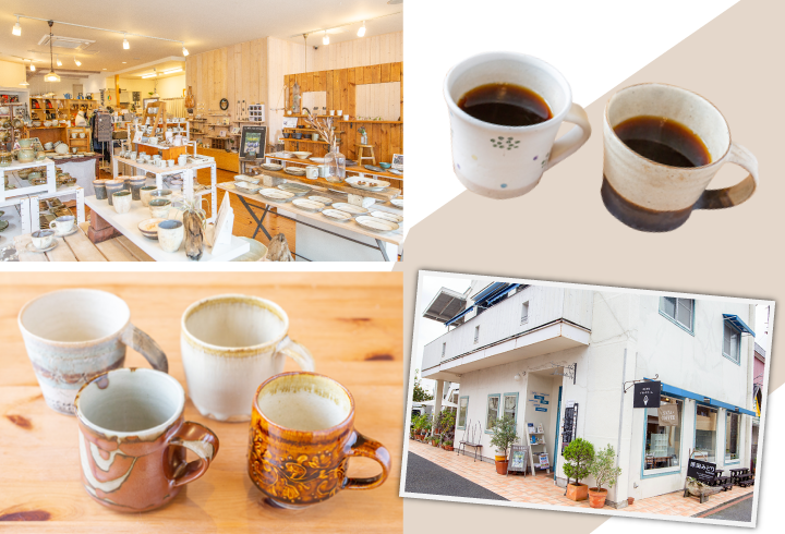 奥に併設されたカフェスペースでは、笠間焼のカップでコーヒーを飲んでほっと一息。ソフトクリームなどのスイーツと一緒に心もお腹も満たされて◎