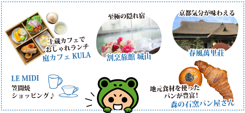 笠間稲荷神社を参拝して、門前通りを散策したらランチへGo♪江戸時代末期の土蔵をリノベーションした漆喰壁の建物は、伝統が息づく笠間のまちにぴったり。石畳の小道を通り店内に入ると、木のぬくもりが心地良い落ち着いた空間が広がります。おすすめは、キッシュ・フリッター・生ハム・サラダ・フルーツなどが笠間焼の器に盛られた「KULAプレート」。メニューは日替わりで、旬の茨城県産食材を彩りよく取り入れた目でも舌でも楽しめるここだけの味です♪夏はかき氷、秋は栗スイーツなど時季のメニューも豊富!天気の良い日はぜひ庭のテラス席へ。ゆったり広いお庭ではペットと一緒に過ごすことも可能です。
