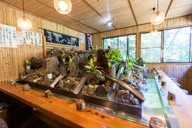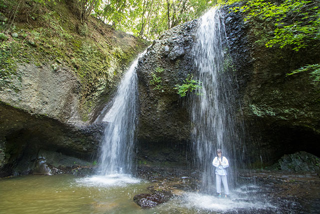 日本屈指のマイナスイオンで満たされるパワースポット。幅12メートル、高さ17メートルの美しい滝です。「裏見の滝」「くぐり滝」とも呼ばれ、表からだけでなく滝が落ちる水柱の裏側にまわって滝鑑賞ができる珍しい滝でもあります。また、滝の目の前の敷地内には大関さんが営む常陸秋そばの店『月待ちの滝もみじ苑』があります。深さ100mからくみ上げた地下水を使って打つ手打ちの細切り蕎麦は一食の価値あり。もりそばは900円。玄蕎麦を蕎麦の実の色で選別した緑のそば(1,300円)は要予約。5月~9月にかけては流しそうめんの食べ放題や茨城県内産の天然カキ氷も。珍しいパワーチャージ(滝行)体験で身も心もきれいになって味わう蕎麦も格別です。