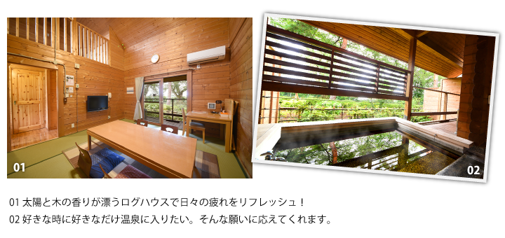 隣接の全室個室露天風呂付ログハウスでは休憩・宿泊ができます。ご家族でグループで、思川のせせらぎを聞きながら、自然に囲まれホッとする癒しを気軽に堪能しませんか♪