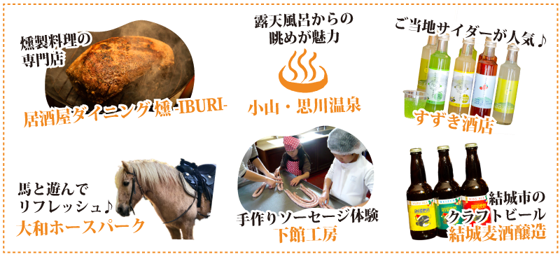 鬼怒川・五行川・思川と豊富な川があることから多くの歴史ある酒蔵が今も引き継がれる県西エリア。乗馬体験や珍しい燻製料理に出逢え、少し足を延ばせば天然温泉も楽しむことが出来ます。お土産にはご当地サイダーやクラフトビールをチェック♪