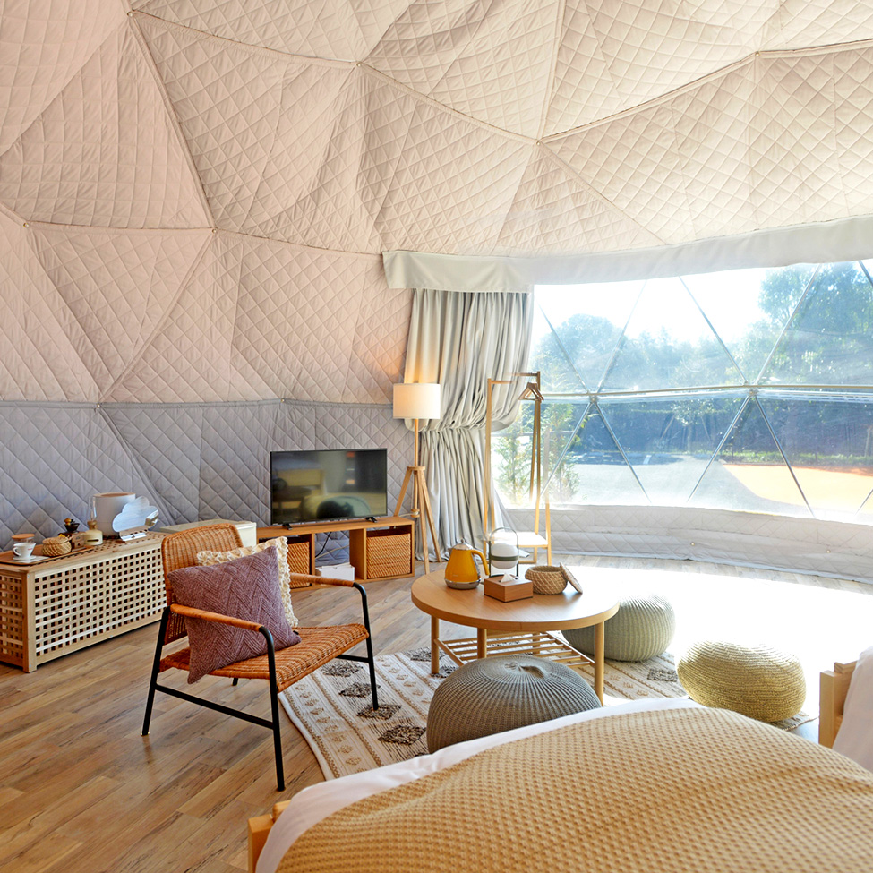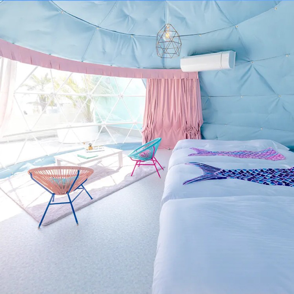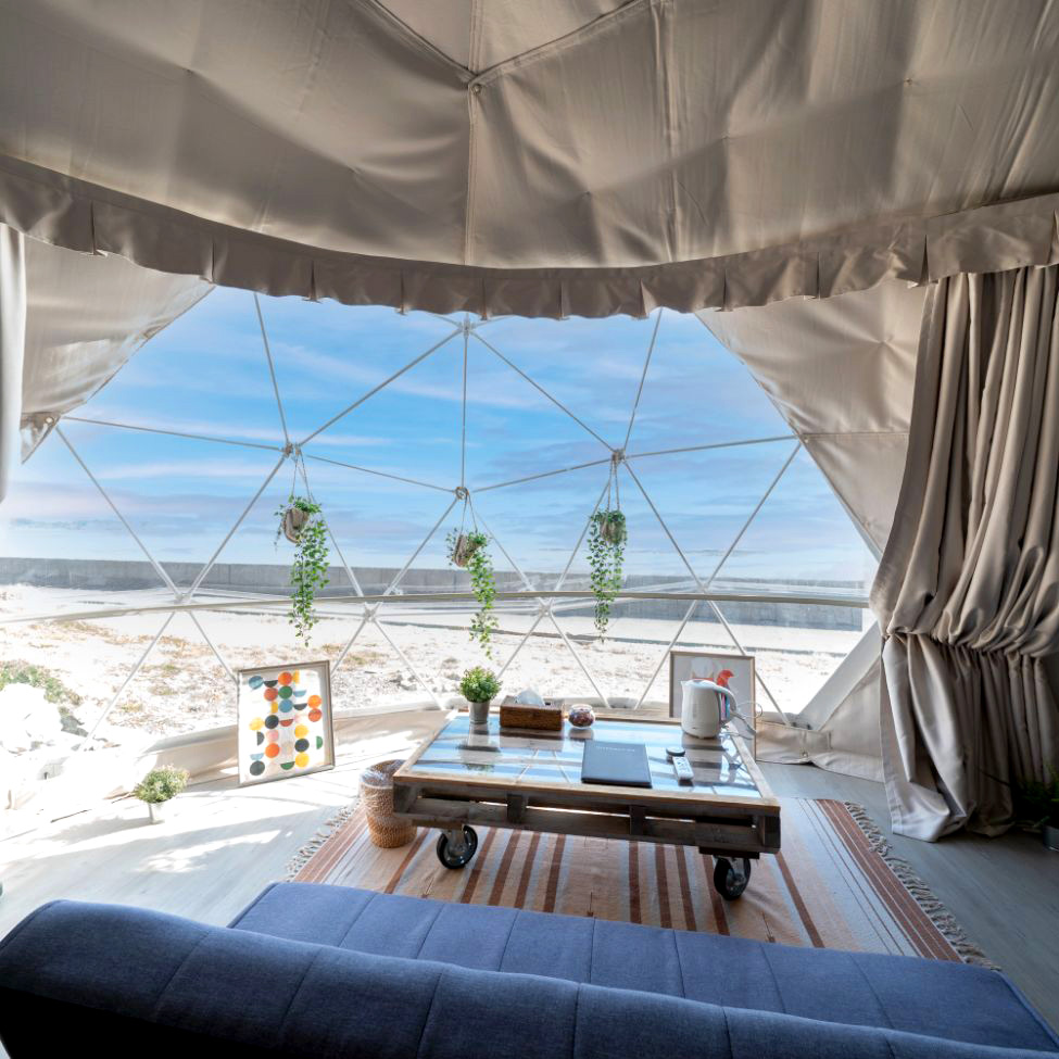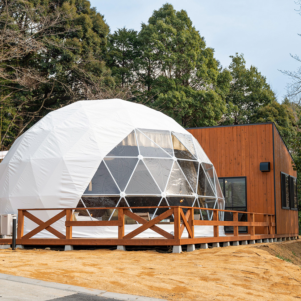 3種類のドームテント内はインテリアコーディネーターがプロデュースした、どこを切り取ってもフォトジェニックな空間。ナチュラルなウッド調のインテリアで、ほっこりと優しい気分に♪プライベート感を確保したウッドテラスでゆったりと外の空気を感じてください。