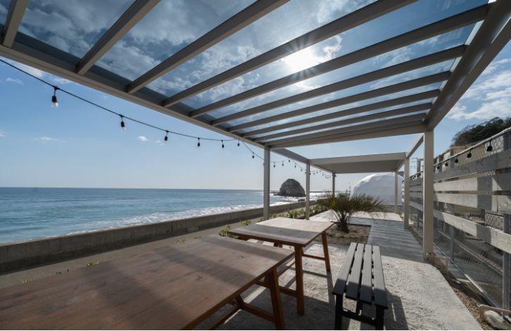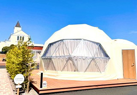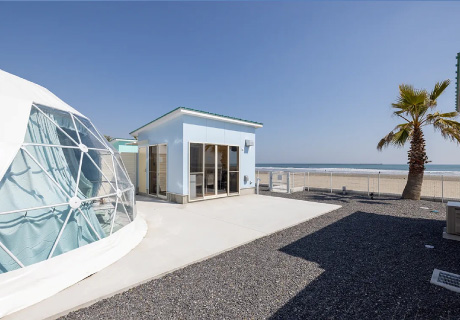水平線から昇る絶景の朝日を望む、抜群の眺望を誇る温浴施設を併設したグランピング施設。大型のドームテント、グランピングトレーラーを配置し、大自然・アクティビティを満喫するラグジュアリーなキャンプを体験できます。
