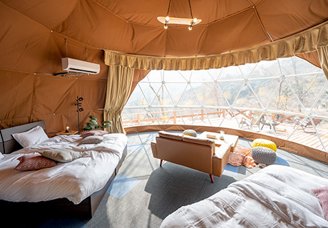 2022年3月にオープンしたばかりのグランピング施設。全15棟、4種のお部屋からお気に入りのグランピング棟が選べます。ヨガやサウナ、キャンプギアの無料レンタルなど、体験型のアクティビティも充実しており、従来のキャンプとは異なる楽しみ方ができるのもポイント!さらには、全客室エアコン完備&個別のトイレ・お風呂&アメニティ完備だから、小さなお子様も女性も安心して過ごすことができますよ♪