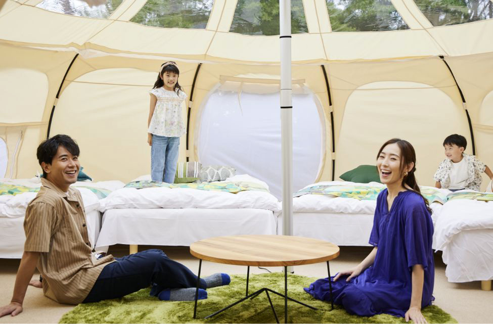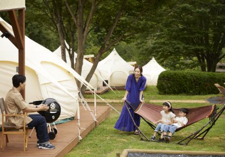 都会を離れ、森の中で味わう癒しのひととき。ホテルシェフが季節ごとに監修するこだわりのBBQ。ここにしかない極上のアウトドア体験を家族と一緒に。3種類から選べるテントや各種プランが用意されているので、プライベートな空間で特別な時間を過ごしてみてはいかがでしょうか。