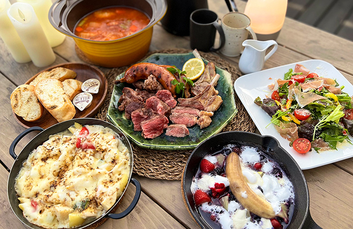 地元の食材を贅沢に味わえるグランピングBBQ。料理は全てあらかじめ調理してあるので、グリルで焼くなどの最終工程だけでOKというお手軽さ。そのため、キャンプ初心者でも気負わずにBBQを楽しめるのも嬉しいですね!