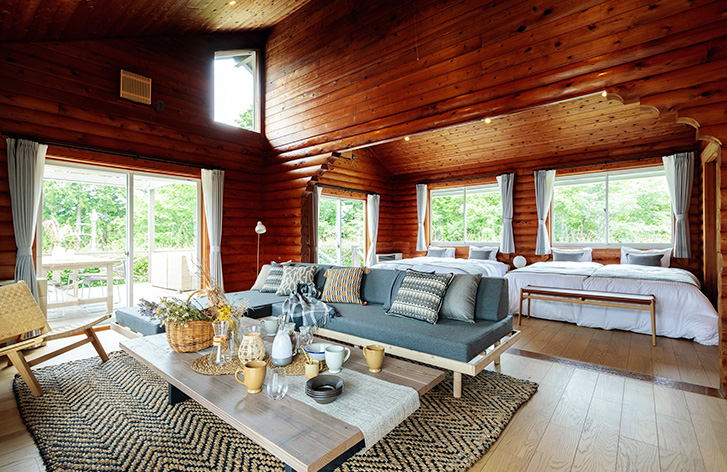 宿泊はログハウスやテントなど計4種類から選べ、どれも手ぶらでOK。「株式会社アクタス」がデザインを監修し、細部のインテリアにまでこだわった空間が広がります。全棟独立型なので自分達だけの時間をお過ごしください。