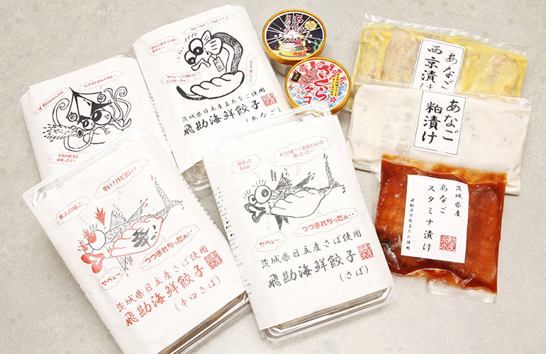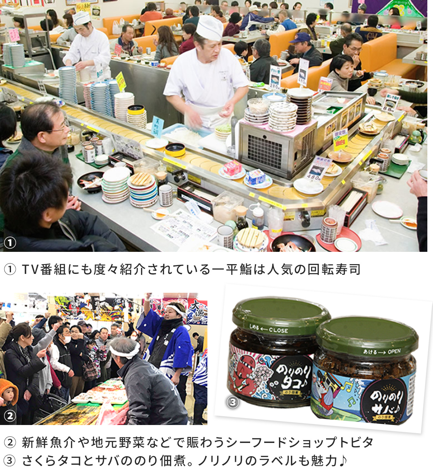 水産庁長官賞を受賞した「さくらタコちま」をはじめ、オリジナル商品が豊富。鯖・イカ・穴子の海鮮餃子やアンコウ・さくらタコのジェラートなど珍しいお土産品も。シーフードショップには新鮮魚介類が並んでいます♪