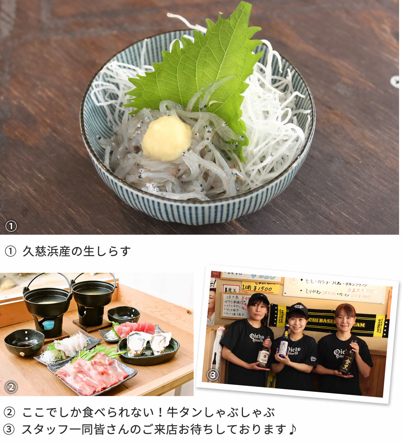 地元久慈浜で獲れた新鮮な魚介、特に生しらすは一匹一匹しっかりと旨味を感じることができます。他にもお店特製のもつ煮や串焼きなどもおすすめです。お酒は種類豊富にあり一杯330円~とお得感満載♪