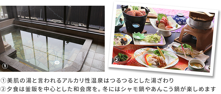 100%天然源泉の湯は「美肌の湯」としても知られるアルカリ性温泉です。