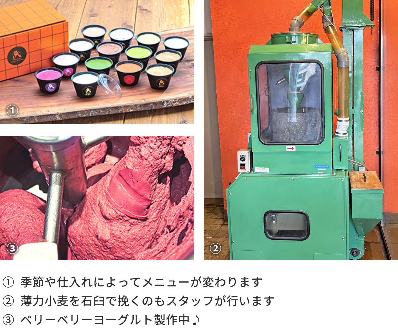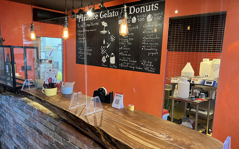 身体にも地球にもいいものを作りたい、と始めた自然栽培。スタッフが栽培する鹿島在来大豆を工房で絞り、豆乳と自家製の甘酒ベースのジェラートが15種類、自然栽培小麦とおからのドーナツも◎
