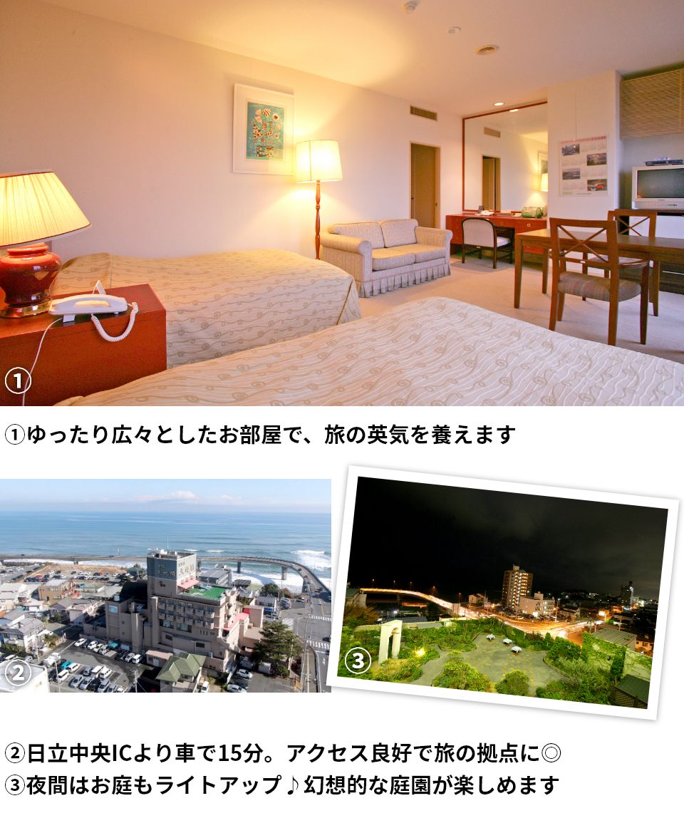 太平洋が一望できる「ホテル天地閣」。アクセス良好で、レジャーや観光の拠点として最適な立地が魅力です。老舗ならではの安心感あるおもてなしで旅の疲れを癒し、日立観光を楽しんでみてはいかがでしょうか。