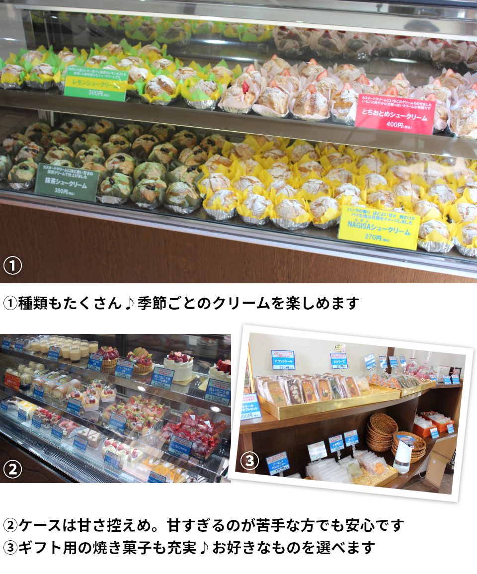 シュークリームだけでなく、厳選した素材を使ったケーキも人気です。季節ごとの旬なフルーツも楽しめるのが魅力♪ホールケーキも各種取り揃えているので、お誕生日やクリスマスなどのパーティーイベントも彩ります!