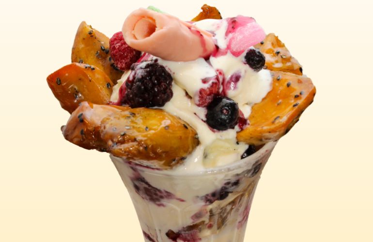 ゴロゴロ大学芋のボリューム満点パフェ1000円。バニラアイスとソフトクリームの間にも大学芋やMIXベリーソースが!フローズンベリーと求肥、バームロールが新感覚!