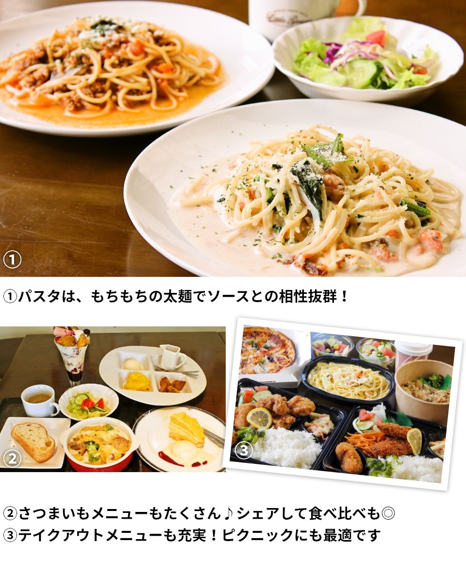 角記念市民ギャラリー内にあるカフェダイニング。カフェメニューではボロネーゼやサーモンクリームパスタが人気です♪2mmのもちもち太麺がソースとよく絡み、ボリューム満点!デザートには、さつまいもスイーツもどうぞ♪
