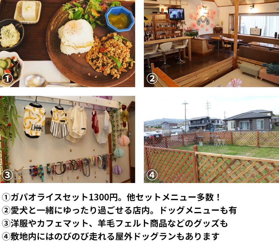 天候に左右されず、ワンちゃんと一緒にゆっくりお食事を楽しんでいただけるドッグカフェです。ドリンク付きの食事メニューのほか、ソフトドリンクや夜にはお酒も飲める居酒屋メニューもご用意しています。また店内では、洋服をはじめとしたドッググッズやアクセサリーなど作家さんの商品も取り扱い中。人も愛犬もリラックスして笑顔になれる、楽しいひとときをお過ごし下さい。