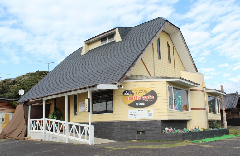 人も愛犬も、みんなが笑顔になれるスマイルカフェ。屋外ドッグランの他、店内にもフリースペースがあります。そして、味に定評ある食事メニューが豊富で、夜はお酒も!ペット関連グッズも取扱い中。