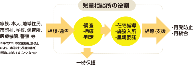 もしも児童虐待が起こってしまった場合、児童相談所(児相)はどういった役割を担うのでしょうか?児相はまず相談や通告を受けると、虐待について調査や判定、指導にあたります。その際、立入調査や一時保護など、強い権限を認められているのが特徴です。その後は在宅指導や施設への入所措置、里親の委託をするほか、再発防止のための切れ目のない支援をしていきます。