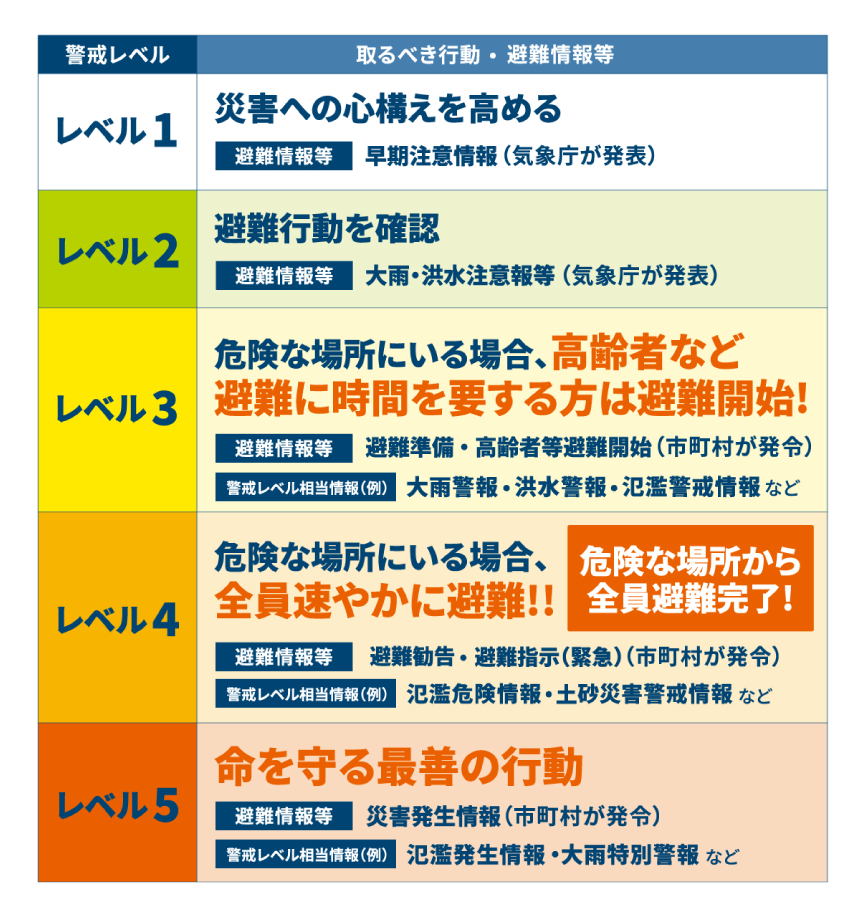 警戒レベル3や警戒レベル4で、地域の皆さんで声をかけあって、安全・確実に非難しましょう!