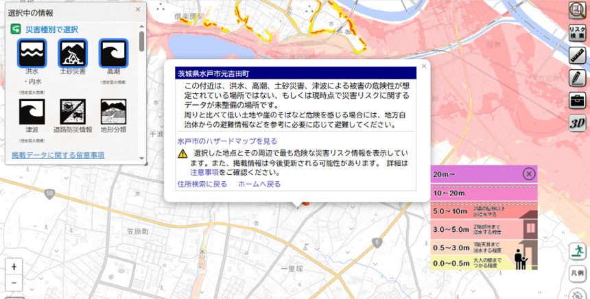 ※洪水、高潮のうち複数の浸水リスクが該当する場合、浸水度が最も大きくなる災害種別の情報だけが表示されます。