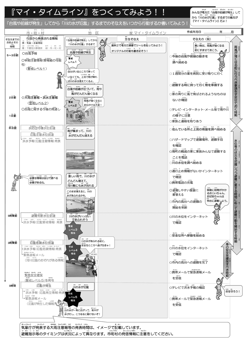 マイ・タイムラインとは、台風などの風水害に備えて、「いつ」「誰が」「何をするのか」をあらかじめ決めておく、いわば防災のスケジュール表。ペットを含めた「マイ・タイムライン」を作成し、いざという時の避難に活用しましょう。