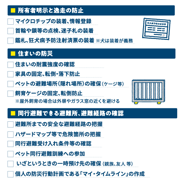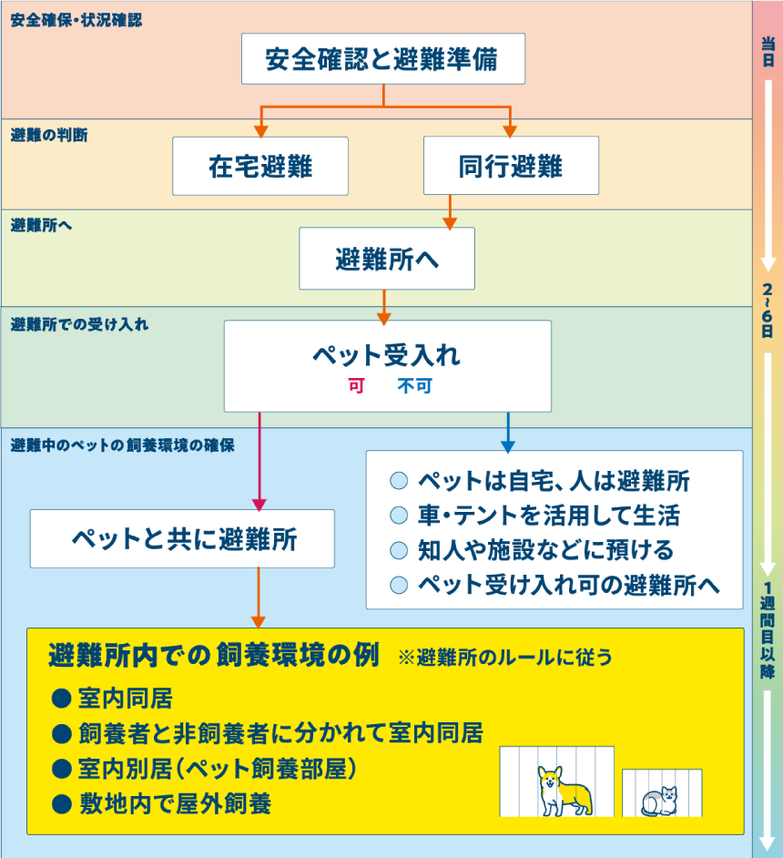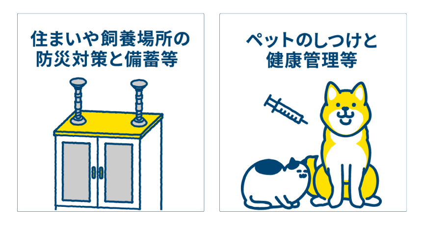 ・「同行避難」とは、災害時に飼い主がペットを連れて避難する避難所等まで避難することを指し、避難所等において飼い主がペットを同室で飼養管理する「同伴避難」とは異なりますのでご注意ください