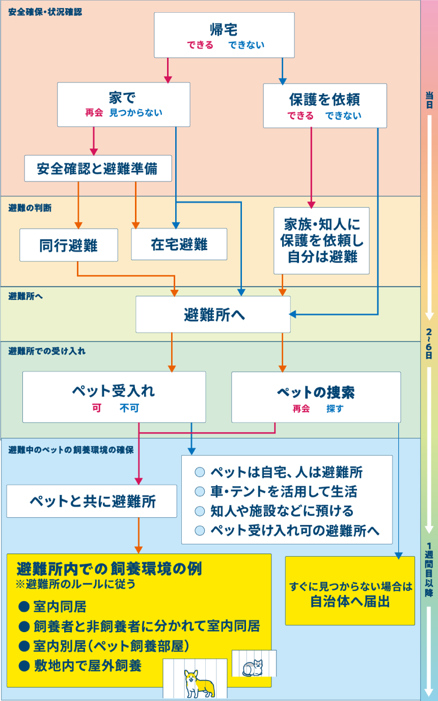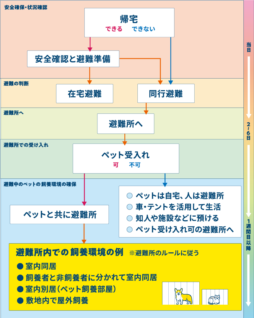 いざという時に慌てないためには、あらかじめ行動をイメージしておくことが大切です。ここでは想定される3つのケースごとに、ペットと一緒に避難する流れを紹介します。