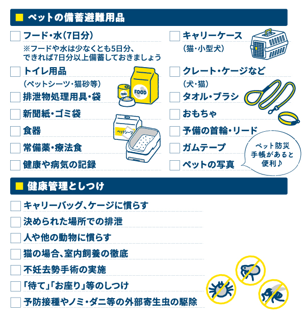 突然の災害でもペットと安心して過ごすためには、普段からの備えが欠かせません。日頃から準備しておくことで、避難先でも落ち着いて行動できます。ここでは、同行避難を見据えた『持ち物リスト』と『日常から整えておきたいポイント』を整理しました。
