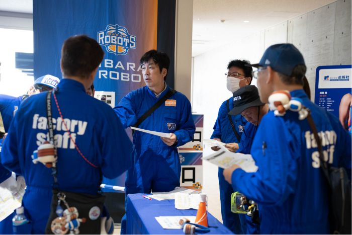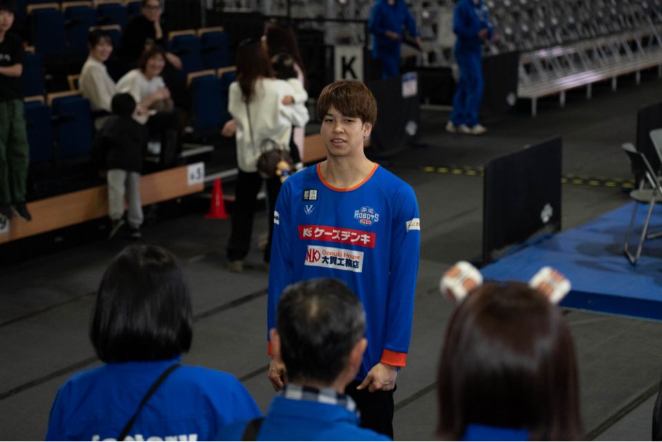 各持ち場が落ち着くと終礼の時間。その日に起こった出来事や気になる点を互いに共有します。運営スタッフが気付けない部分まで気付けるのもRO-VOLTSならでは。 また、終礼中にロボッツの中村功平選手が訪問!試合運営に携わってくれたRO-VOLTSのメンバーに感謝を伝えました。 この日の業務はこれにて終了!お疲れ様でした。