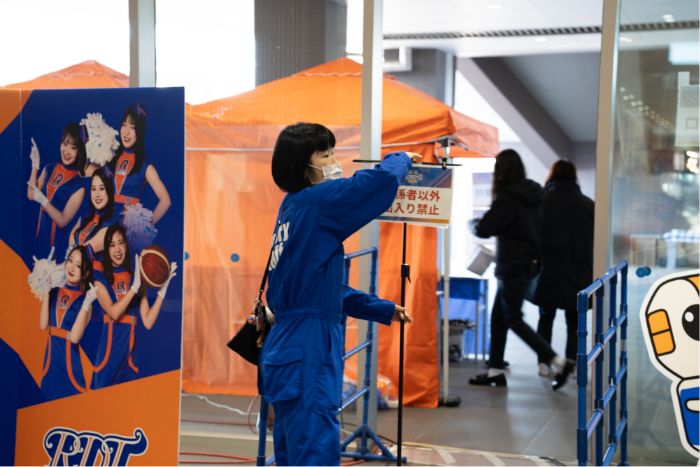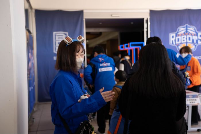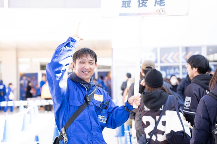 会場の外では大勢のロボッツファン「ブースター」が、入場時間まで列を作って待機中。待機列係のスタッフが列を整理しながら、ファンクラブ用の列や一般列などの案内を行います。