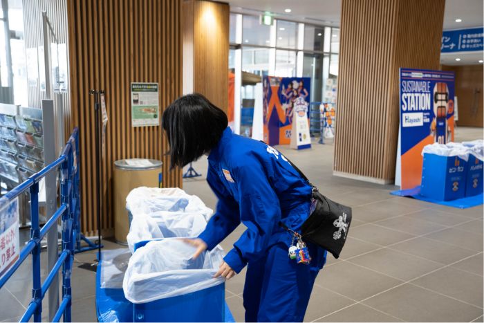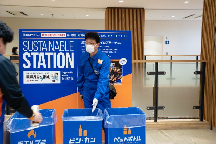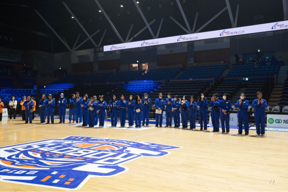 無事に試合終了!お見送りしながら「分別をお願いします!」とゴミの回収を呼び掛けます。メインアリーナ内は座席の食べ残しや忘れ物を回収する清掃部隊が出動!