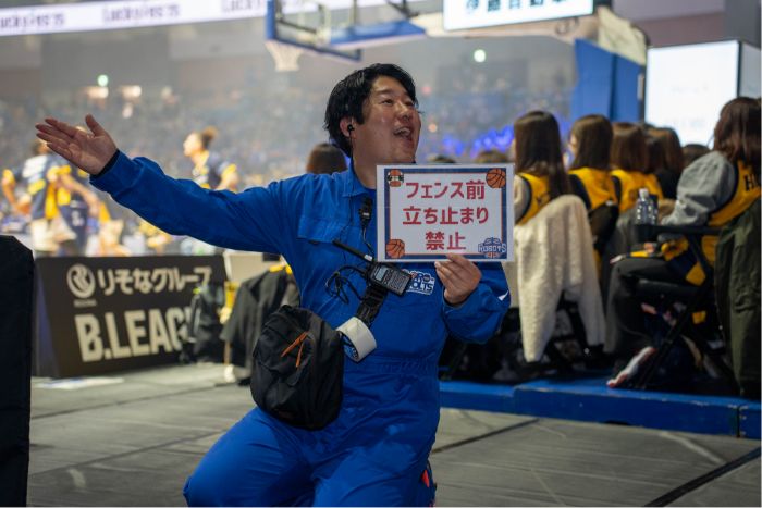 アリーナではブザーが鳴り響いて試合開始!試合中はアリーナ内で何が起こるか分からないもの。ボールが観客へ飛んでこないか、倒れた看板のチェックなど緊張感を持って見張ります。
