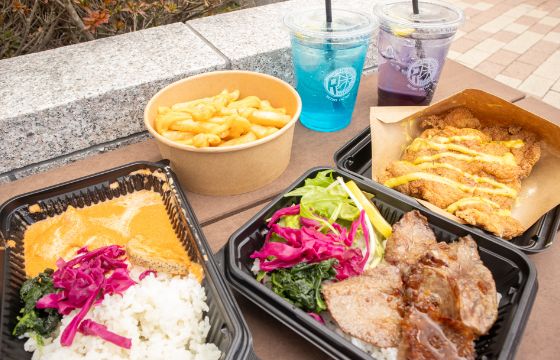 (写真手前左よりバターチキンカレー、常陸牛カルビ丼、写真奥左よりフライドポテト、ブルーブルーレモネードソーダ、バタフライピーソーダ、それチキ)