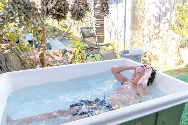 【3】サウナ室から出たら、汗を一旦流してから水風呂へ(目安は15~30秒)。冷たくて入りにくい場合は体を丸めると入りやすくなります。