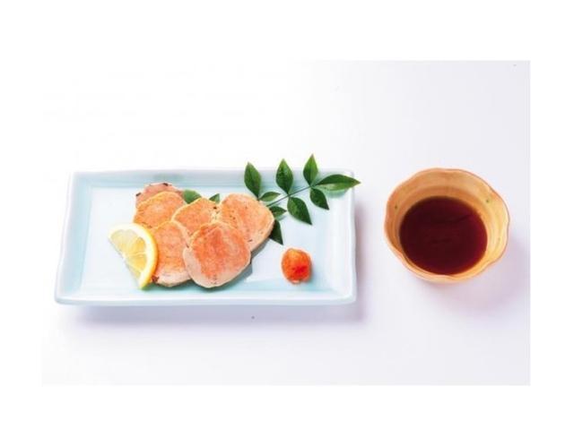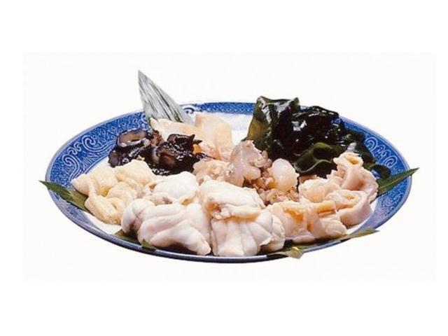 共酢和えは、あっさりとした身を茹でたものや、コラーゲンたっぷりの皮や胃などを煮凝り状にしたものを、共酢(あんこうの肝を合わせた酢味噌。肝のことを「とも」ともいうことが由来)につけて食べる料理です。あんこうの各部位の異なる食感が楽しめます。