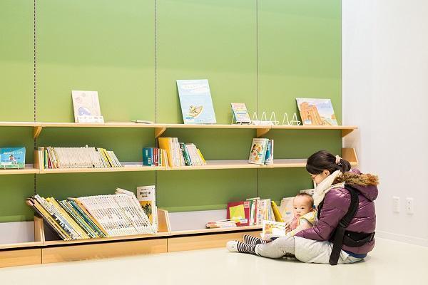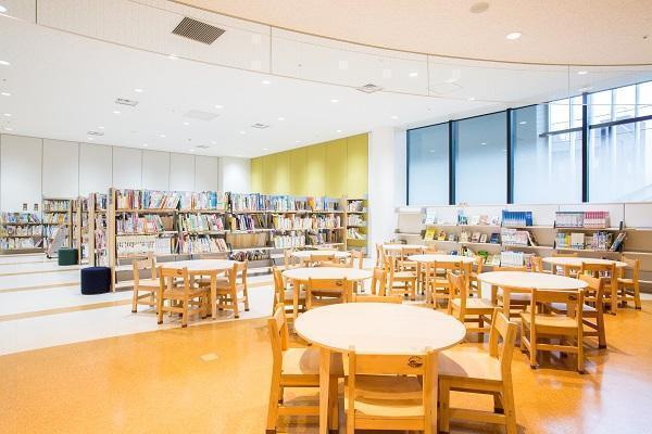 3万7000冊の児童書が開架棚に!そばには白木作りの子ども用の椅子やテーブルが用意されています。授乳室や子ども用トイレあり。