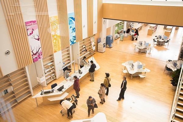 その願いがまさに形になり、施設面積5120m²、開館時の蔵書数は約35万冊(最大可能数は56万冊)、さらに650席の閲覧・学習席を備え、県内市町村では県立図書館に次ぐ規模を誇る施設になりました。また建物は北欧をイメージし、お洒落な机や椅子も並んでいます。吹き抜けや窓を通して自然の光がふんだんに入り、とっても居心地のいい空間になっています♪