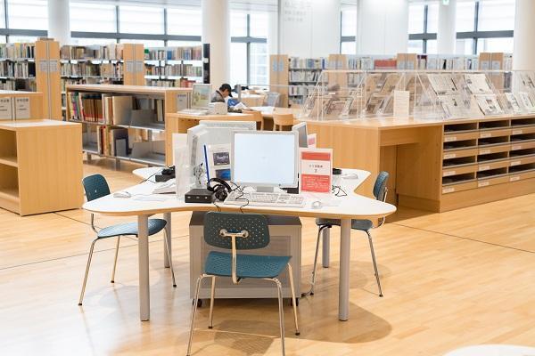 館内には、視覚障害者などを対象にした対面朗読のための部屋や高齢者に優しい大活字本のコーナー、今やなくてはならない、インターネット用端末・オンラインデータベース用端末・AV視聴用端末も完備されています。