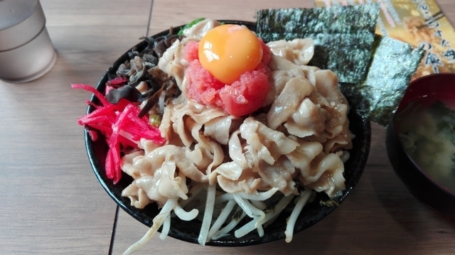 また昼に訪れ、先月から期間限定でやっていると言う「"トリプルすたみな"がっつき塩ホル丼」を 並盛で注文しました。"トリプルすたみな"とは、すたみなとろろ、肉厚豚ホルモン、こってり塩ニンニクダレのコンボとのことで、総重量約800gとか。生卵1個とワカメ・ネギの味噌汁も付いて来ます。生卵を割り混ぜ、丼の真ん中に流し込んで食します。豚ホルモンは豚モツと豚バラ肉、キャベツ、ニラ、もやしを塩味で炒めているようで、並盛とは言え、これらが丼内で山を成しています。塩ニンニクダレには独特の旨味があって美味しい。豚ホルモンの山と下の白飯との間にすたみなとろろの層があって、これも生卵と絡んで美味しいです。並盛で十二分に満腹となりました。