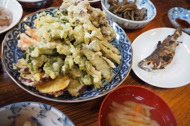 釣った魚は+1000円で定食に!ご飯に味噌汁、山菜料理や天ぷらが付いてボリュームたっぷり!