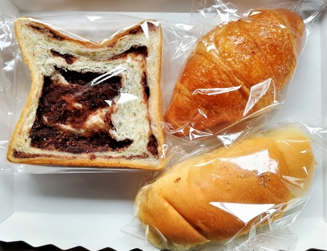 お盆中日に再訪し「あの頃のカレーパン」「ぜっぴんクロワッサン・アールグレー」に加え、お店で人気の「あんこ中毒な太っちょ王様のあん食パン」1斤をテイクアウトしました。カレーパンはまあ普通ですが、クロワッサンは油脂・甘味とアールグレイの香りが良く、美味しいです。あん食パンは4ツ切で、分厚い食パン内にたっぷりの餡子が詰まっており、食事用よりはおやつ用として美味しく味わえました。