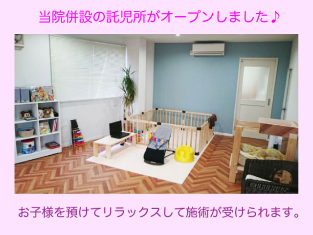◎施術室と託児所は完全に独立!! 育児中1人でリラックスする時間がほとんどない産後ママに完全にリラックスをした状態で受けていただきたいという思いから完全に独立した託児所を併設いたしました。 ◎託児専門スタッフ(ベビーシッター)が対応 専門の資格を持った託児専門のスタッフが産後1ヶ月からのお子様をお預かりいたします。 ◎無料での利用が可能!!( 一部条件あり) 当院の施術を受けに来られた方でプリペードカード、回数券をご購入いただいた方、もしくは5400円以上のメニューをご利用の方に限り無料でご利用いただけます。 ※その他の場合は+500円で利用可能 ◎ご利用時間 平日、土曜日の10:00~16:00の間 ※その他の時間に関してはご相談ください。(必ず対応できるとは限りませんのでご了承ください)