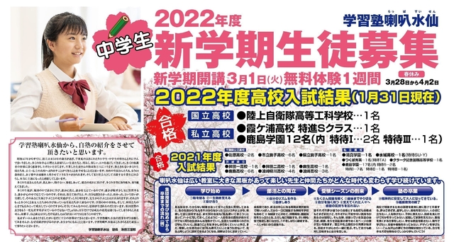 喇叭水仙は3月から新学期開講です。今年度からは感染対策による人数制限や外出制限などが緩和され、学習も滞りなく部活も活発になることが予想されます。中学2、3年生は部活の中心となり疲れが出てくる一方で、勉強内容はさらに難しくなります。皆で競い合い助け合いながら、楽しく勉強を続けましょう。