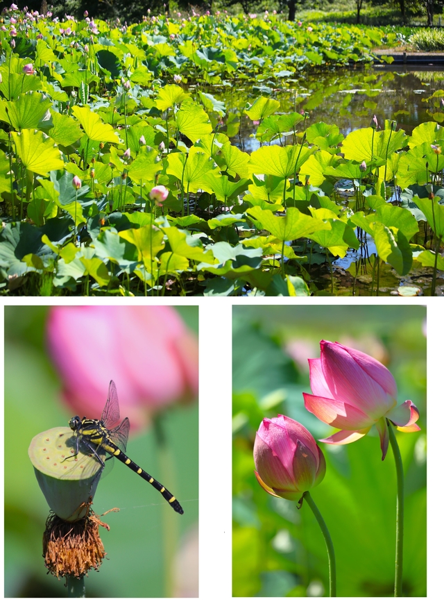 蓮の花が咲いていると友人が教えてくれたので、14時頃行ってきました。日差しが強くちょっと汗ばむような天気でしたが、蓮が沢山咲いていました。トンボも沢山飛んでいました。 ご近所の家族連れでしょうか?何組か遊びに来ていました。