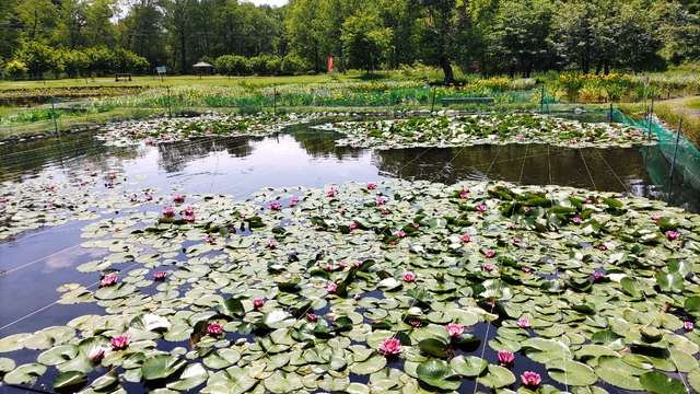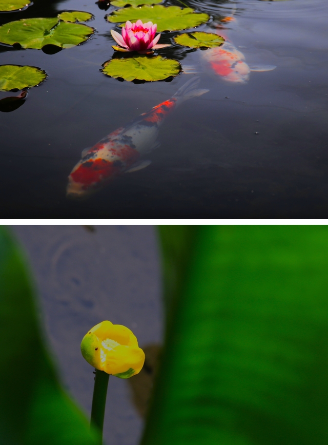 睡蓮が咲き出した傍を錦鯉が優雅に泳いでいました。また、近くの池ではコウホネが可愛い黄色い花を咲かせていました。