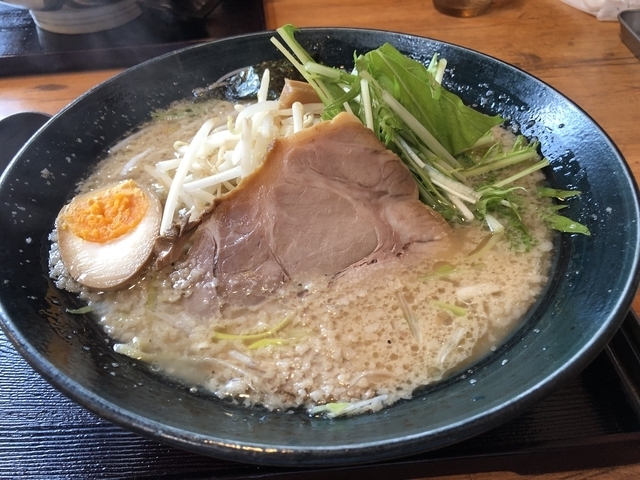 現在ゆきむら亭チェーンで展開している期間限定の「とん豚麺」をこちらで食しました。背脂がそこそこ浮く豚骨醤油味ですが、具として豚叉焼でなく、甘辛く味付けした豚バラ肉の切り落としを使っているのがちょっと変わってます。その他の具は味玉(半熟と言うよりむしろ固茹で)半個、白髪ネギ・水菜に胡麻がけ、刻みタマネギに紅生姜。豚骨スープは意外にあっさりしていて美味でした。