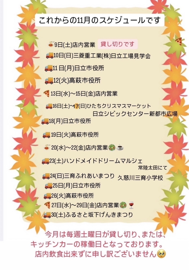 今月は毎週土曜日が貸し切り、または、キッチンカーの稼働日となっております。